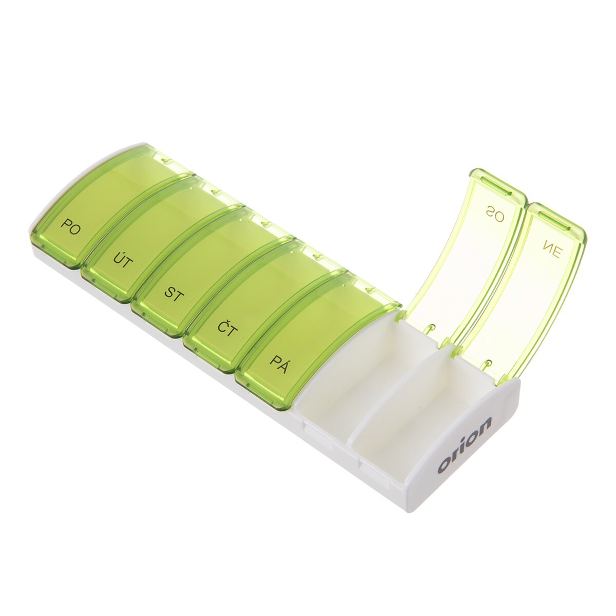 Každá přihrádka je opatřena průhledným zavíracím víčkem s označením dne.