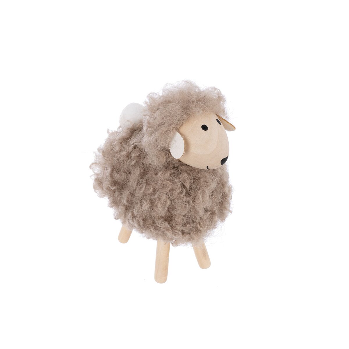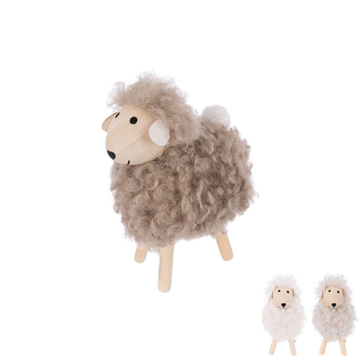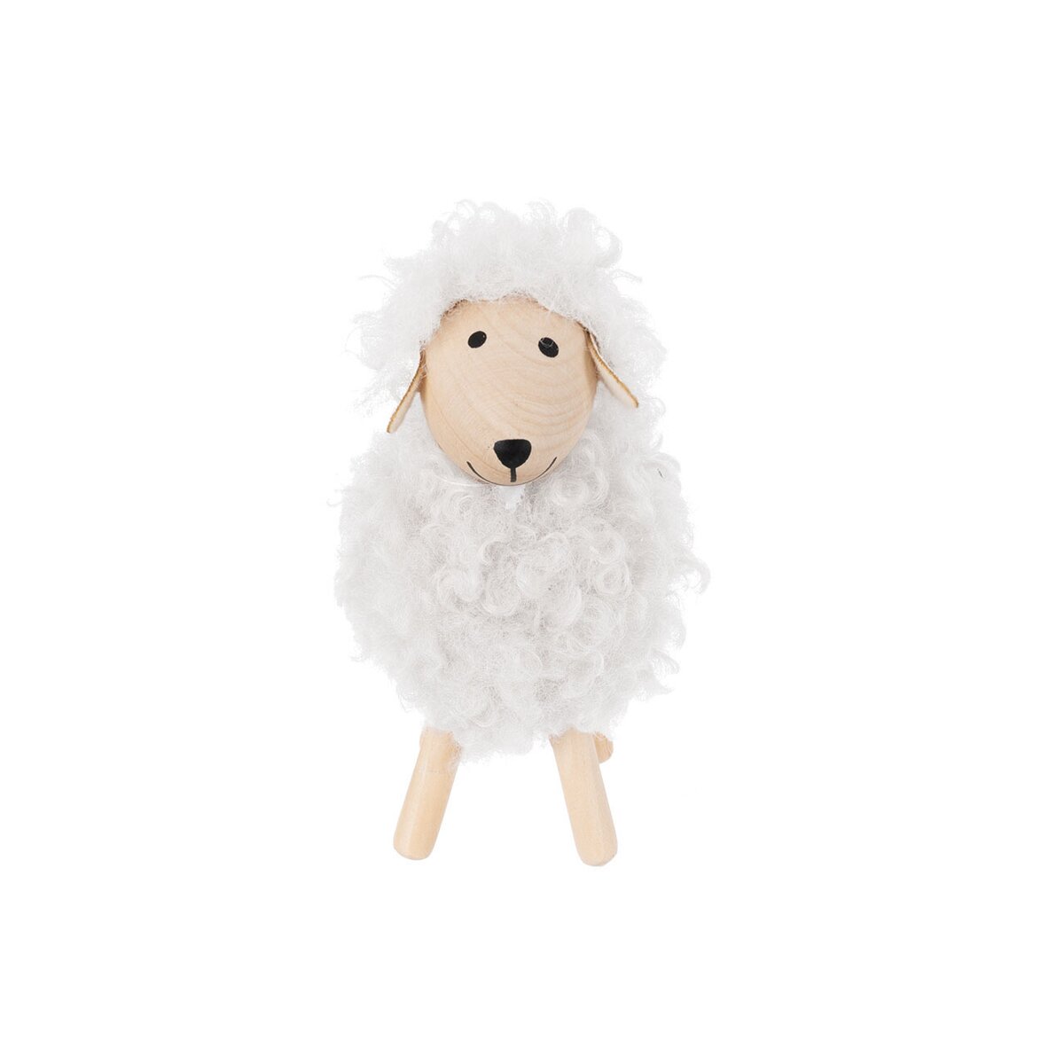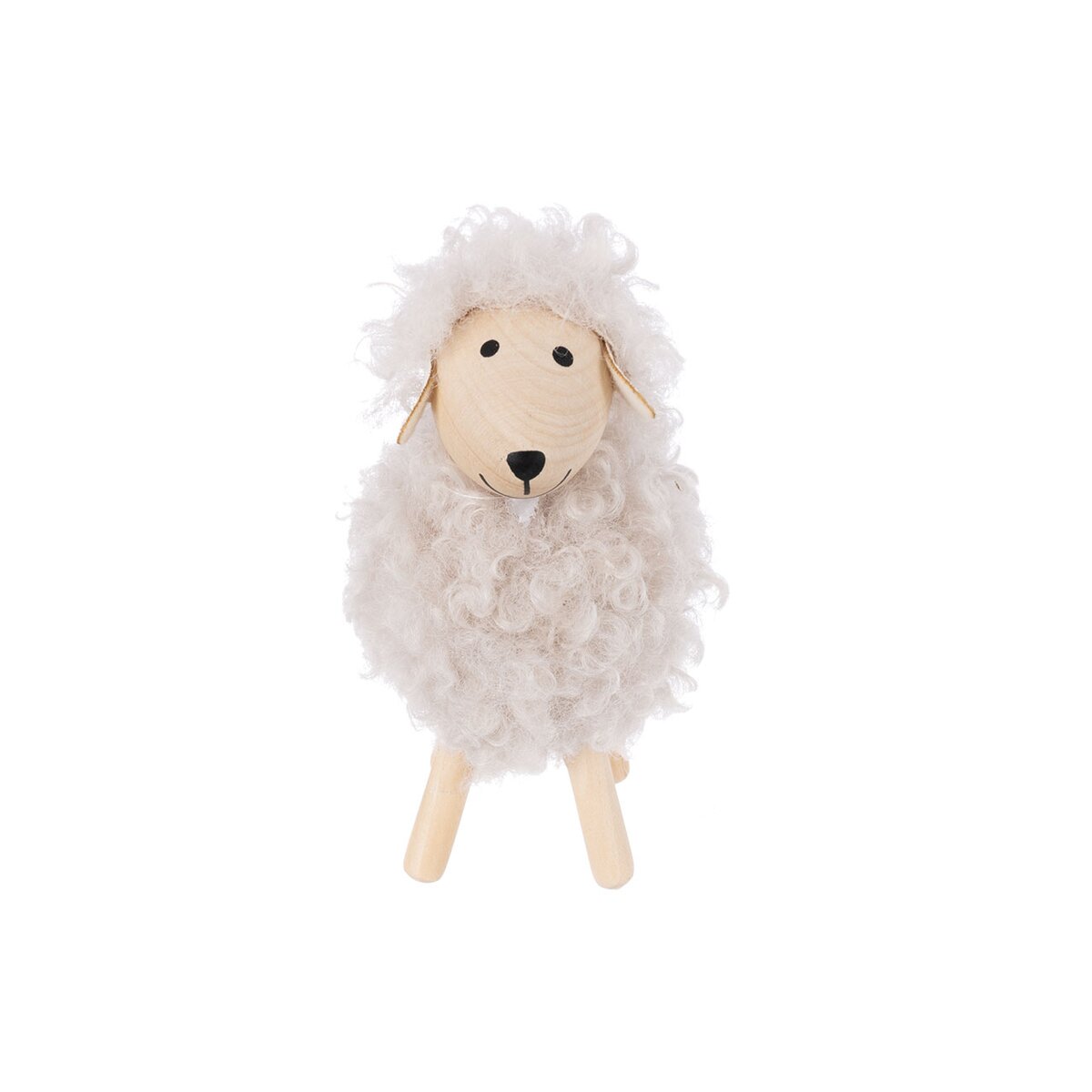 Ovečka má měkké tělo z polyesteru, které připomíná ovčí vlnu, nohy a jemně malovanou hlavu z borovicového dřeva.
