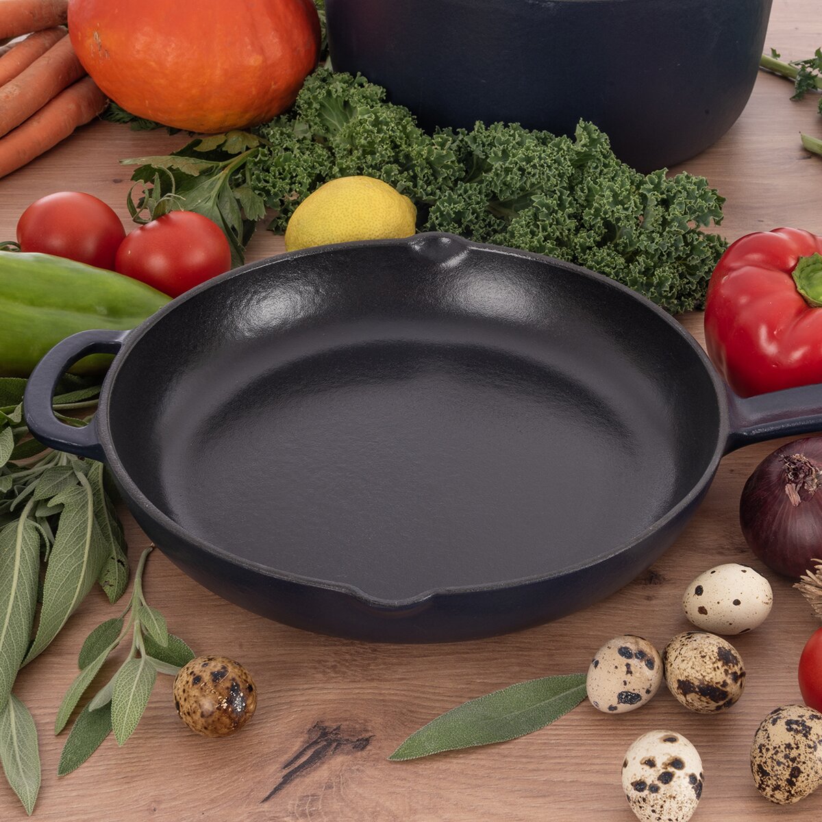 - pánve výšky 4,5 cm a v držadle 6 cm jsou skvělé pro pomalé pečení při nižší teplotě, ale můžete je, jako každou litinovou nádobu, rozpálit na vysokou teplotu, např. při prudkém opékaní masa, aby se zatáhlo (až při 250 °C)