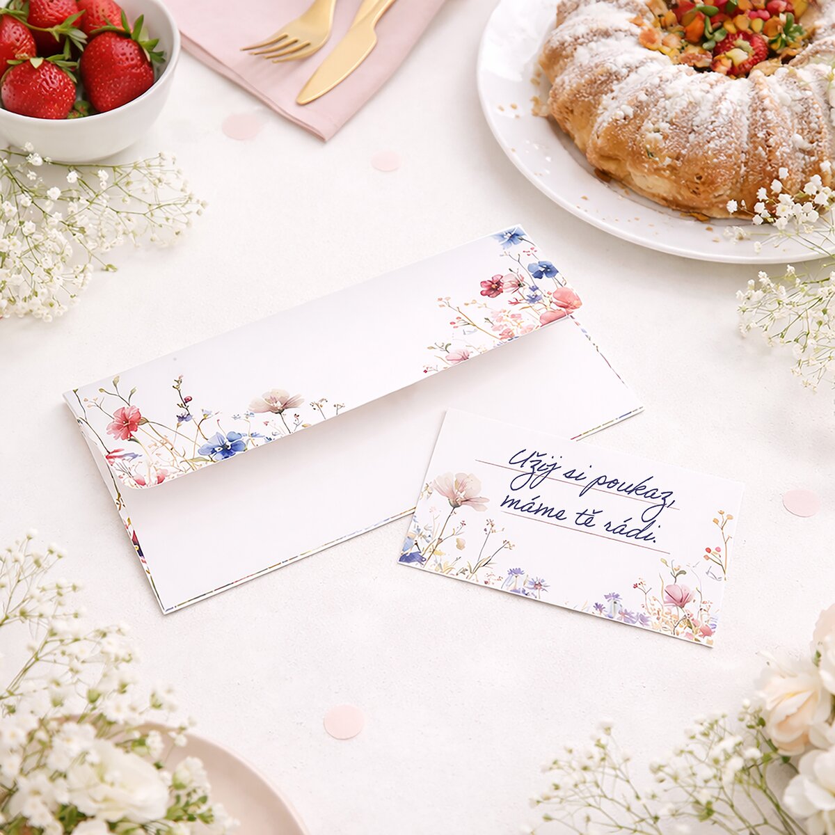 Kód produktu 842380Papírová obálka s vloženou kartou, kam lze napsat poděkování či vzkaz obdarovanému, je určena k decentnímu předání hotovosti, voucheru a různých poukazů. Zdobí ji jemný dekor lučních květin.