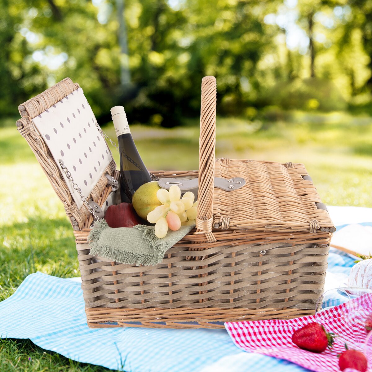 Koš se otevírá z obou stran, takže jej můžete pohodlně naplnit lahví limonády, vody, ovocem, zeleninou, sýry, pečivem a lehkým nádobím, které se na piknik skvěle hodí.