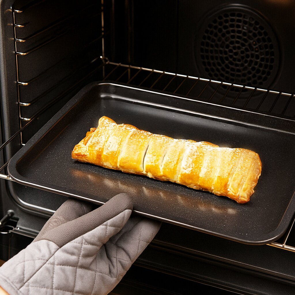 Vnitřní rozměr plechu je 36,5x29 cm, síla plechu je 0,6 mm. A pokud dojde k připečení, např. když vyteče náplň z jablečného štrúdlu, stačí jej nechat odmočit, a poté vložit do myčky nebo umýt ručně.