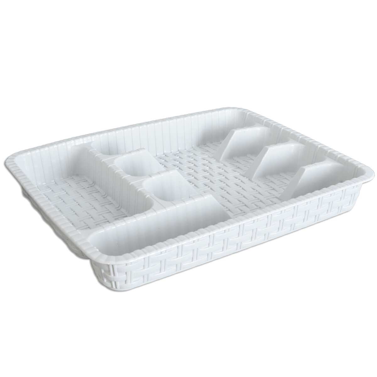 Kód produktu 150739Příborník Vám pomůže udržet pořádek v zásuvkách kuchyňské linky. 5 sekcí. Materiál: plast. Barva bílá, vzor ratan. Rozměry: 29x37,5x5 cm.
