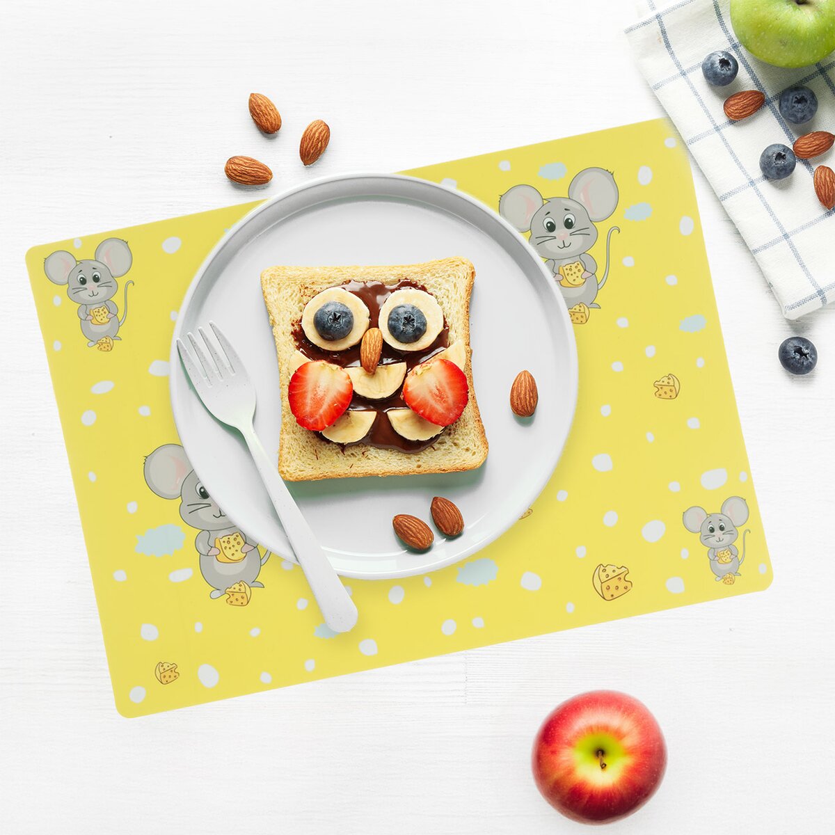 Veselé prostírání obdélníkového tvaru se zaoblenými rohy s dětským motivem roztomilých myšek je ideální pro stolování malých strávníků.