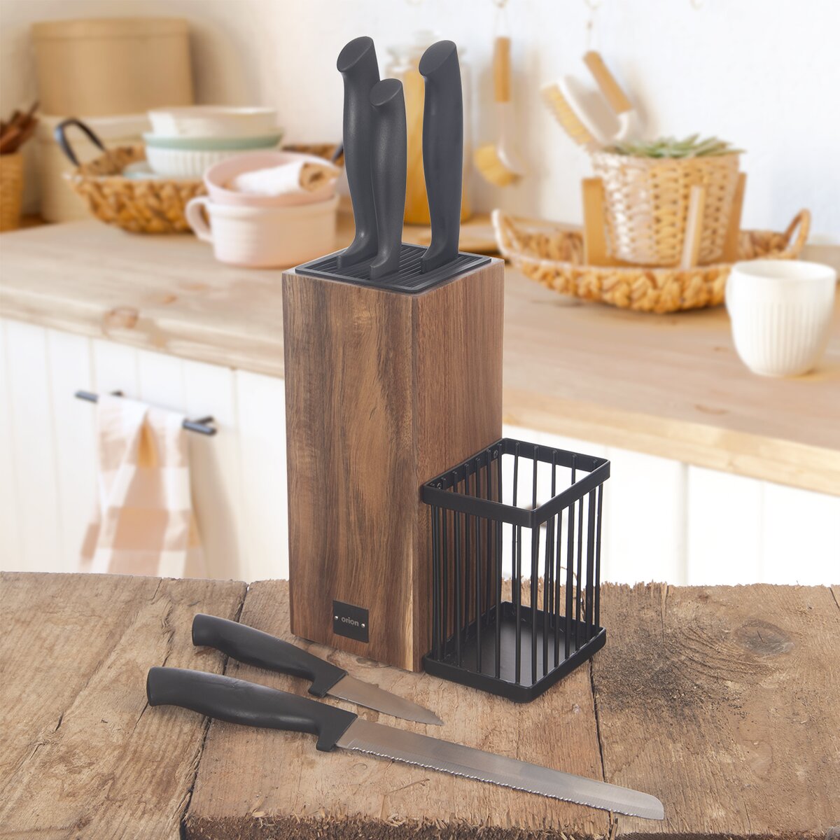 DÁREK k sadě tvoří šikovný stojan na nože s košíkem na drobné kuchyňské náčiní. Zajímavý stojan z akáciového dřeva je doplněn plastovým vkladem, do jehož podélných štěrbin lze zasunout nože různých velikostí. Součástí sady jsou kuchyňské nože s nerezovou čepelí a černou plastovou rukojetí, které slouží ke krájení, porcování, čištění masa, ovoce, zeleniny, ke krájení bylinek. Rozměry nožů: (čepel/celková délka) 7,5/18 cm, 12,5/23 cm, 14,5/27 cm, 20/32 cm, se zubatým ostřím 17,5/30 cm.