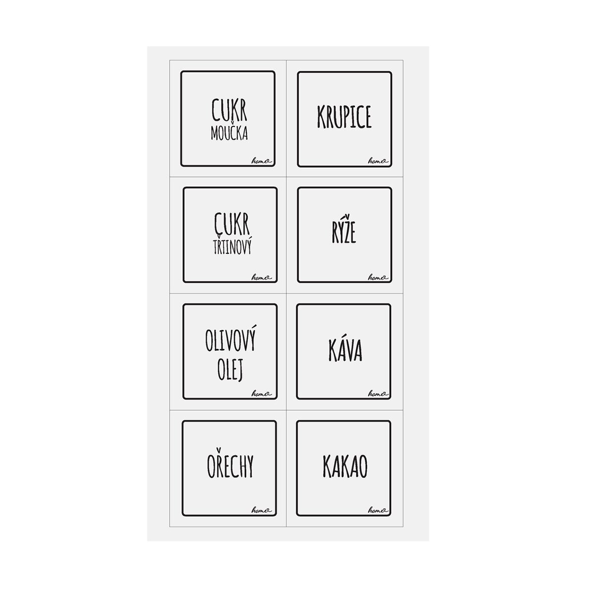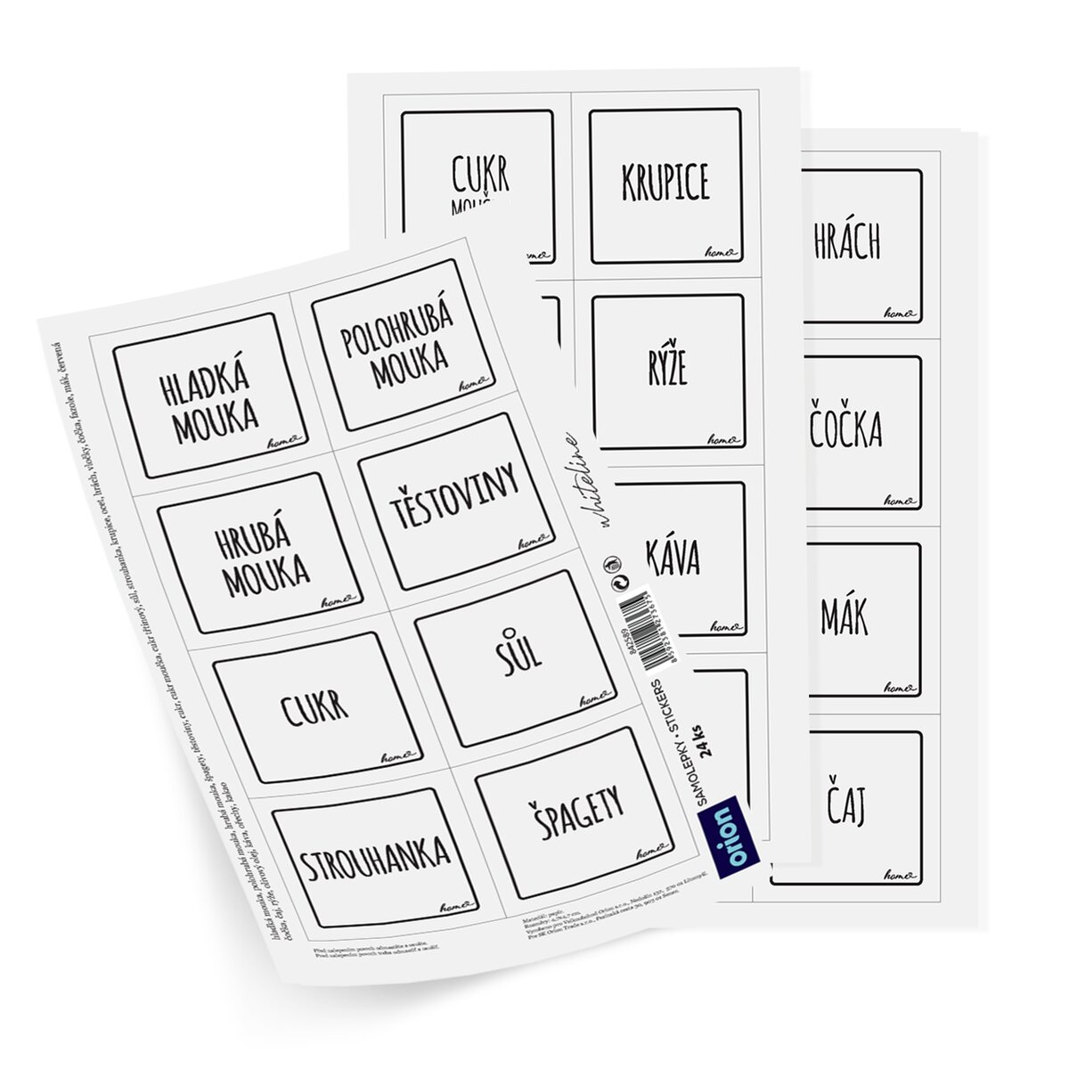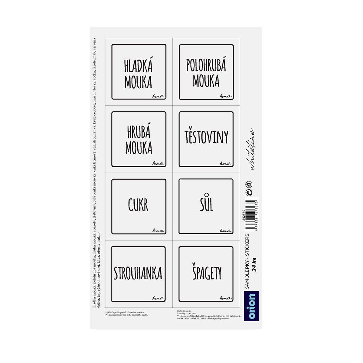 V balení jsou 3 archy (celkem 24 samolepek) s nejpoužívanějšími surovinami, najdete zde např. mouku, cukr, luštěniny, strouhanku, ořechy, olej, ale i kávu, čaj a kakao. Hodí se např. k označení plechových dóz Whiteline nebo různých kořenek.