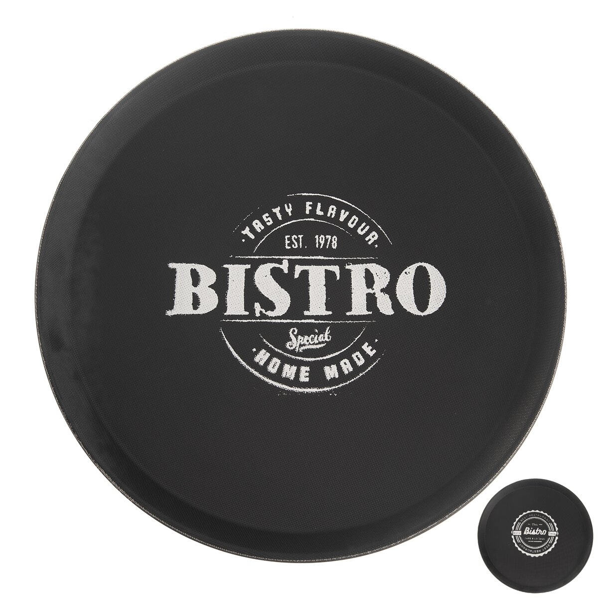 Kód produktu 153846Servírovací tác s protiskluzovou černou povrchovou úpravou a designovým potiskem BISTRO zajistí, že se nádobí při přenášení a servírování občerstvení nesmeká.