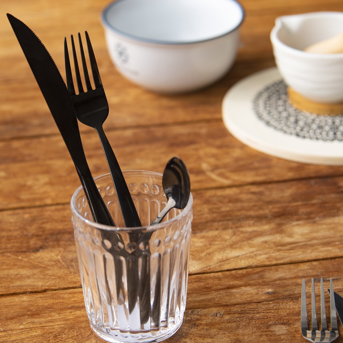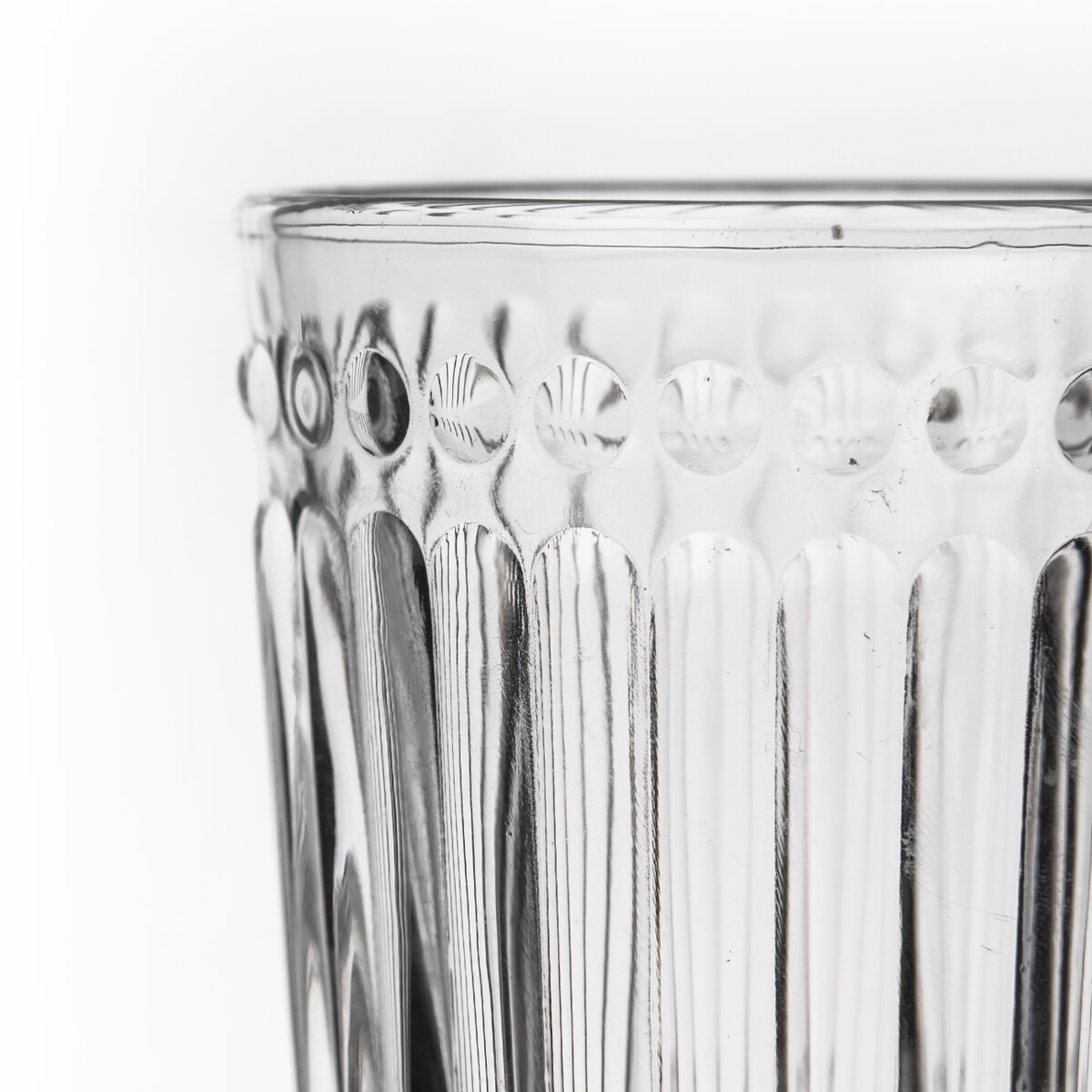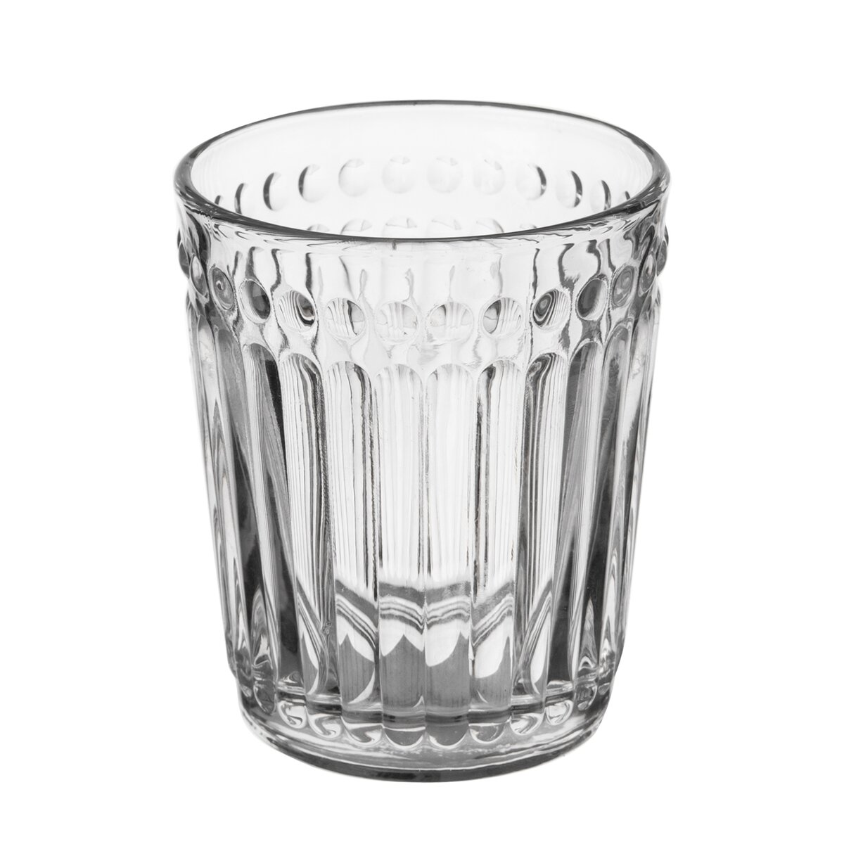 Sklenice s plastickým vzorem. Materiál: sklo. Rozměry: objem 0,32 l, pr. 8 cm, v. 10 cm.