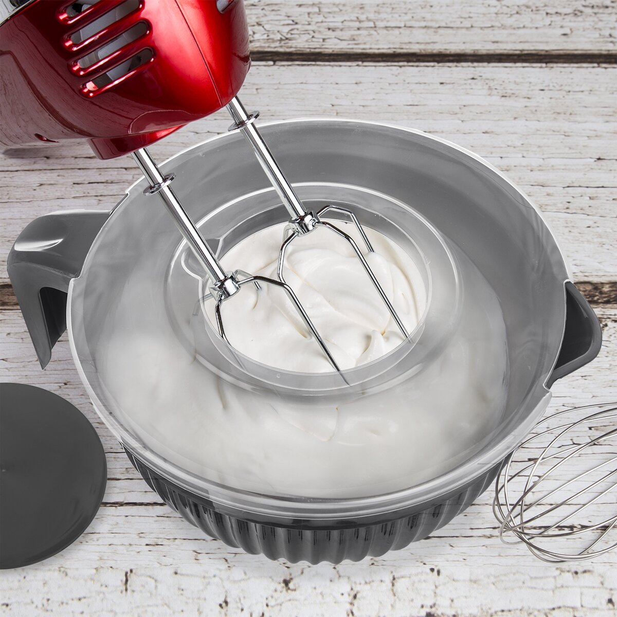 Návod, jak mísu používat: Před šleháním stačí odklopit středovou část víčka, čímž se uvolní prostor pro šlehací metly. Druhý díl víčka zabrání rozstřikování, ochrání kuchyňskou linku před zašpiněním. Aby ušlehané dobroty neosychaly, stačí znovu přiklopit středovou část víčka ke zbytku nádoby. Lze ji mýt v myčce nádobí.