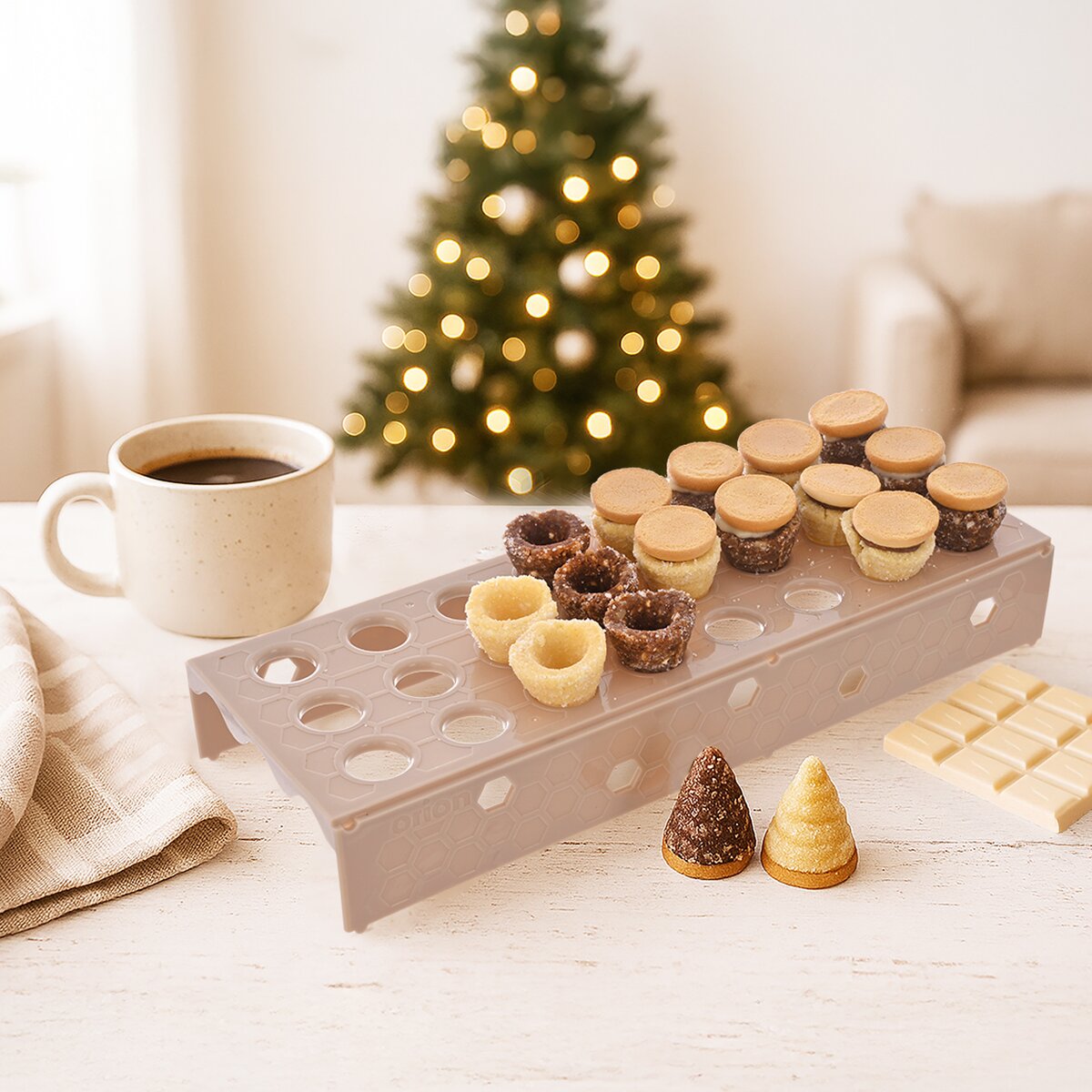Stojan na včelí úlky je praktická pomůcka pro snadné a rychlé plnění tradičních cukrových úlků. Úlky jednoduše vložíte špičkou dolů do otvorů, naplníte je krémem, přiložíte piškot a necháte ztuhnout na chladném místě.