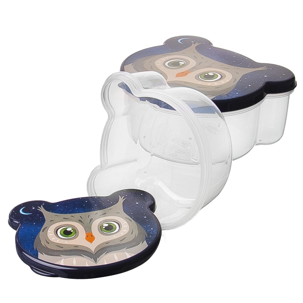 Kód produktu 154012Sada čtyř plastových svačinových boxů s víčkem ve tvaru SOVA. Mají objemy 0,2 l, 0,3 l, 0,5 l a 0,75 l.