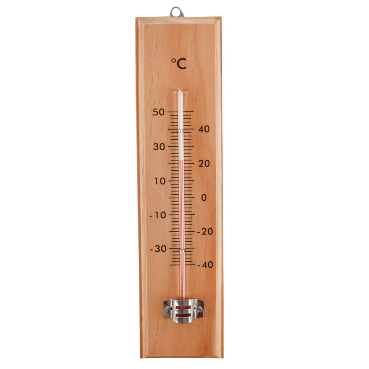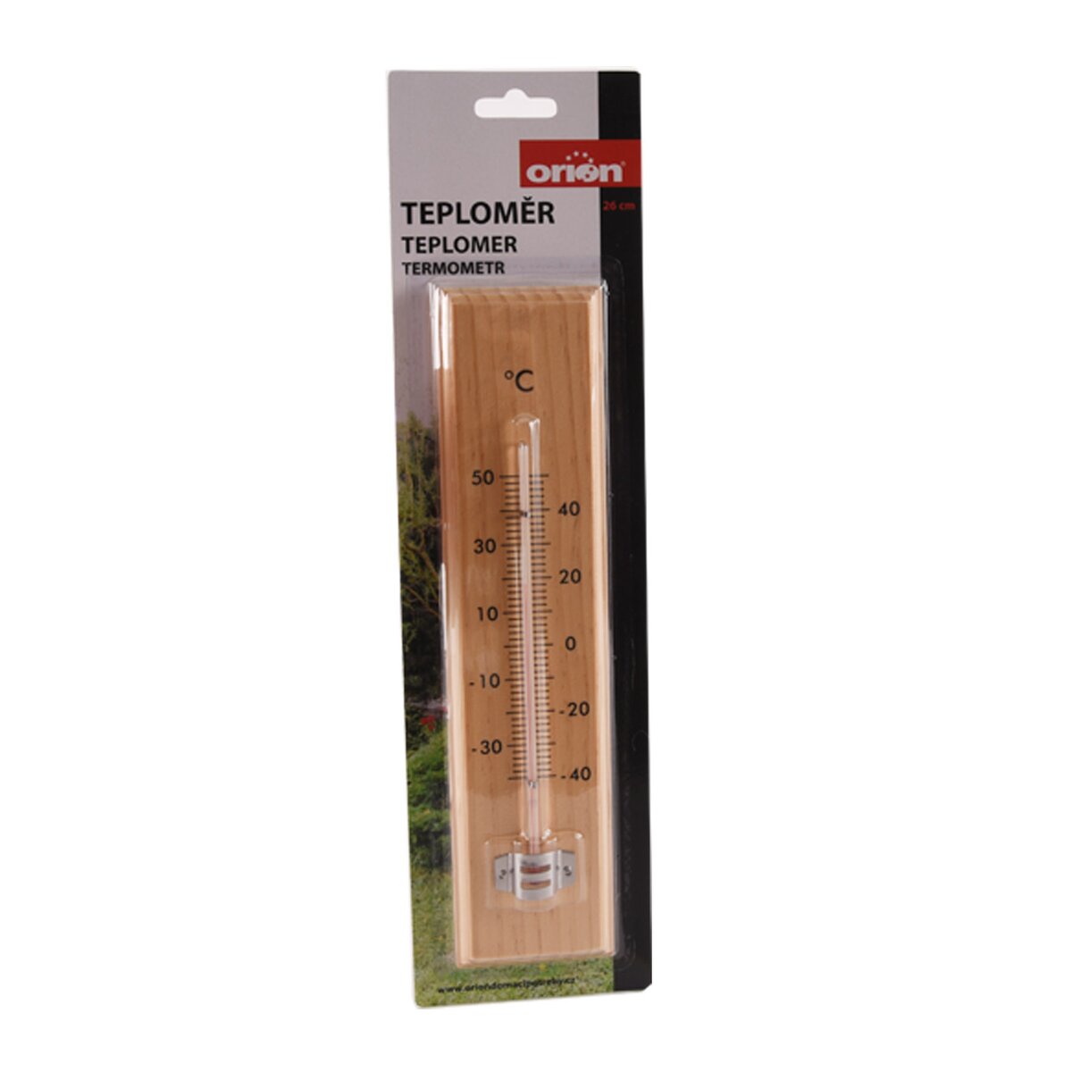 Teploměr využijete pro měření venkovní i vnitřní teploty. Stupnice od - 30 °C do 50 °C. Materiál: dřevo. Teploměr upevněte venku na místo, které není vystaveno slunečnímu záření. Bez rtuti. Rozměry: 6,2x2x26 cm.