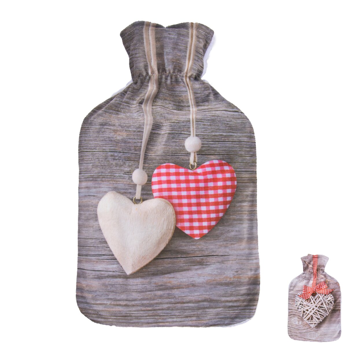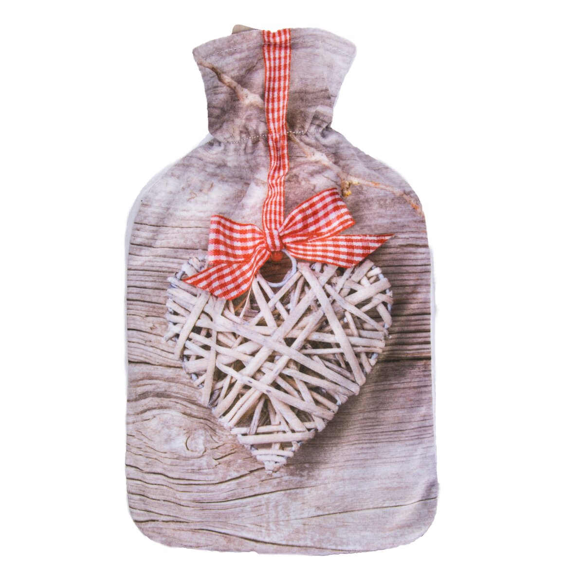 Tento termofor tvoří klasická gumová láhev se šroubovacím uzávěrem, vložená do stylového látkového obalu z polyesteru s vyobrazením srdce na dřevěném podkladu. Nádobu stačí vyndat a naplnit teplou vodou, která bude mít maximálně 40 °C. Samotný vak lze prát v pračce na 30 °C.