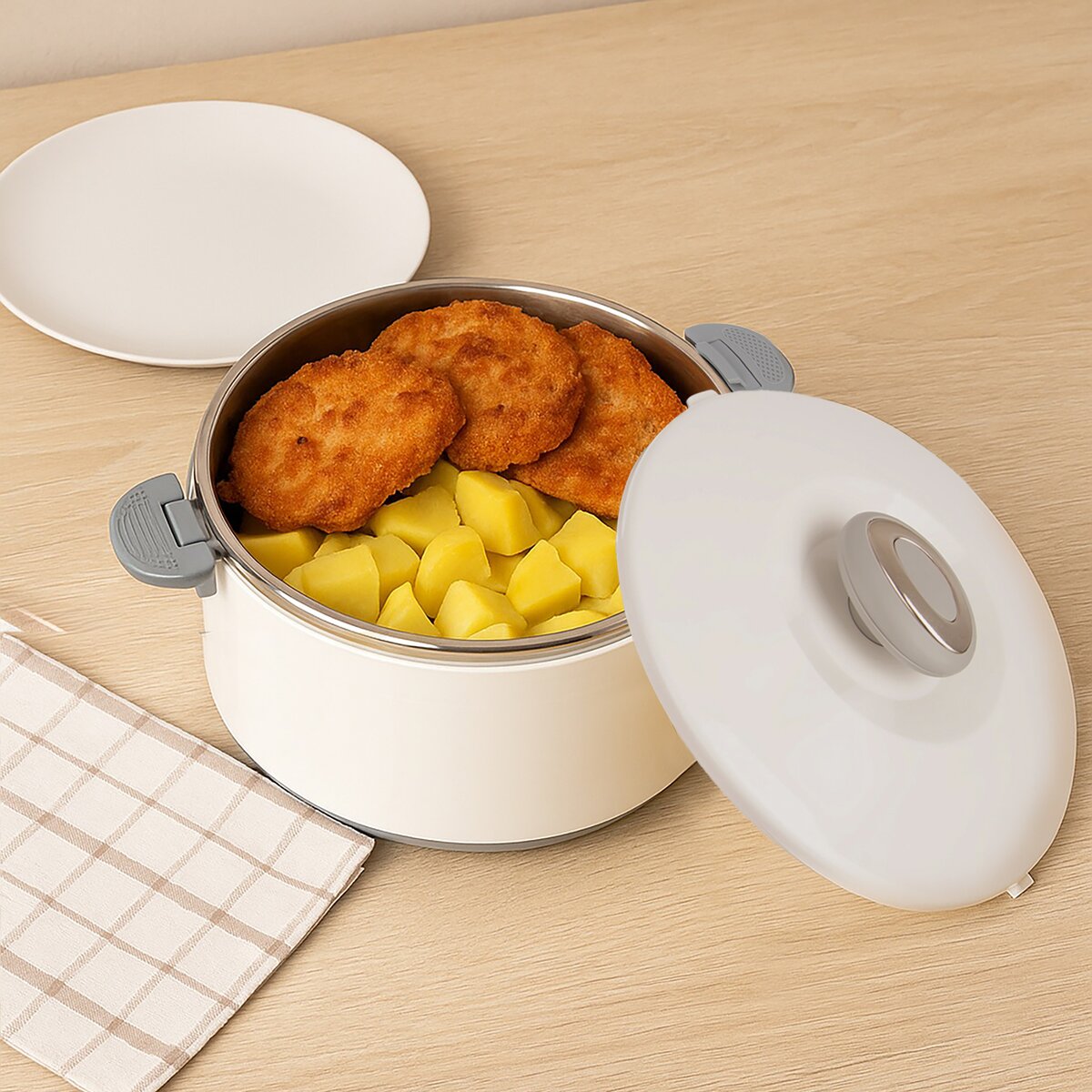 Kód produktu 128538Praktická plastová termomísa TERMO o průměru 24,5 cm je opatřena nerezovým vnitřkem, otočným termo víčkem a sklápěcími uchy. Slouží k uchování teploty vložených teplých nebo studených pokrmů.