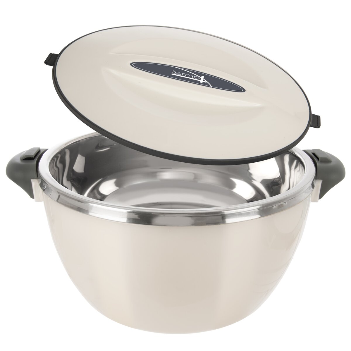 Kód produktu 128539Praktická bílá plastová termomísa TERMO má celkový objem 6 l. Je opatřena hladkým nerezovým vnitřkem a otočným termo víčkem. Slouží k uchování většího množství teplých nebo studených pokrmů.