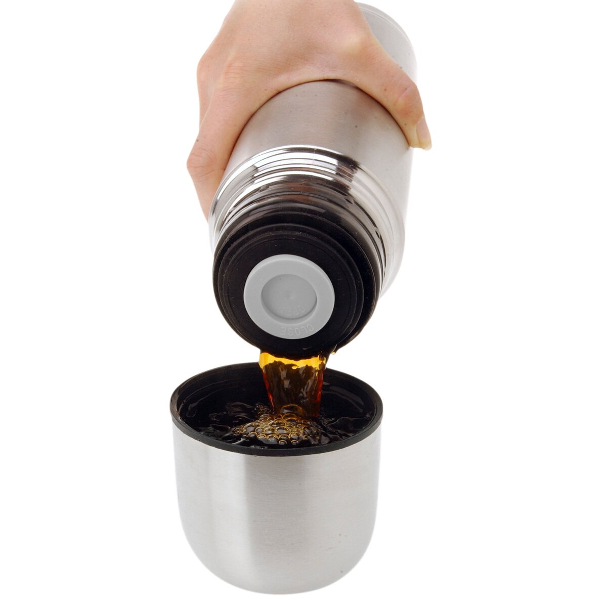 Kód produktu 128505Termoska udrží nápoj dlouho teplý nebo naopak chladný. Víčko slouží jako pohárek. Zátku nemusíte při nalévání odšroubovávat, stačí stisknout a můžete nalévat - nápoj zbytečně nechladne. Materiál: nerez, plast, silikon. Rozměry: objem 1 l, pr. 8 cm, v. 32 cm.