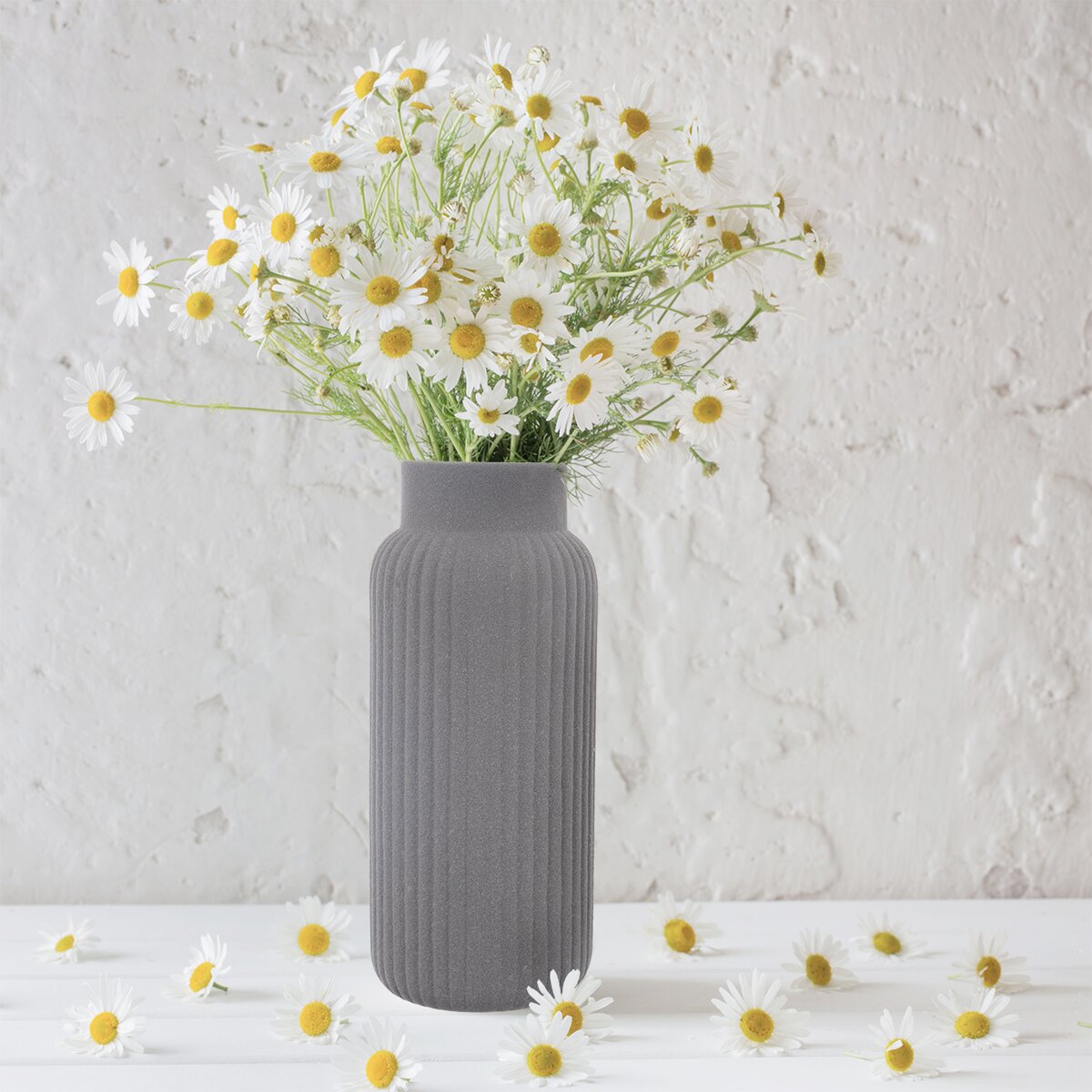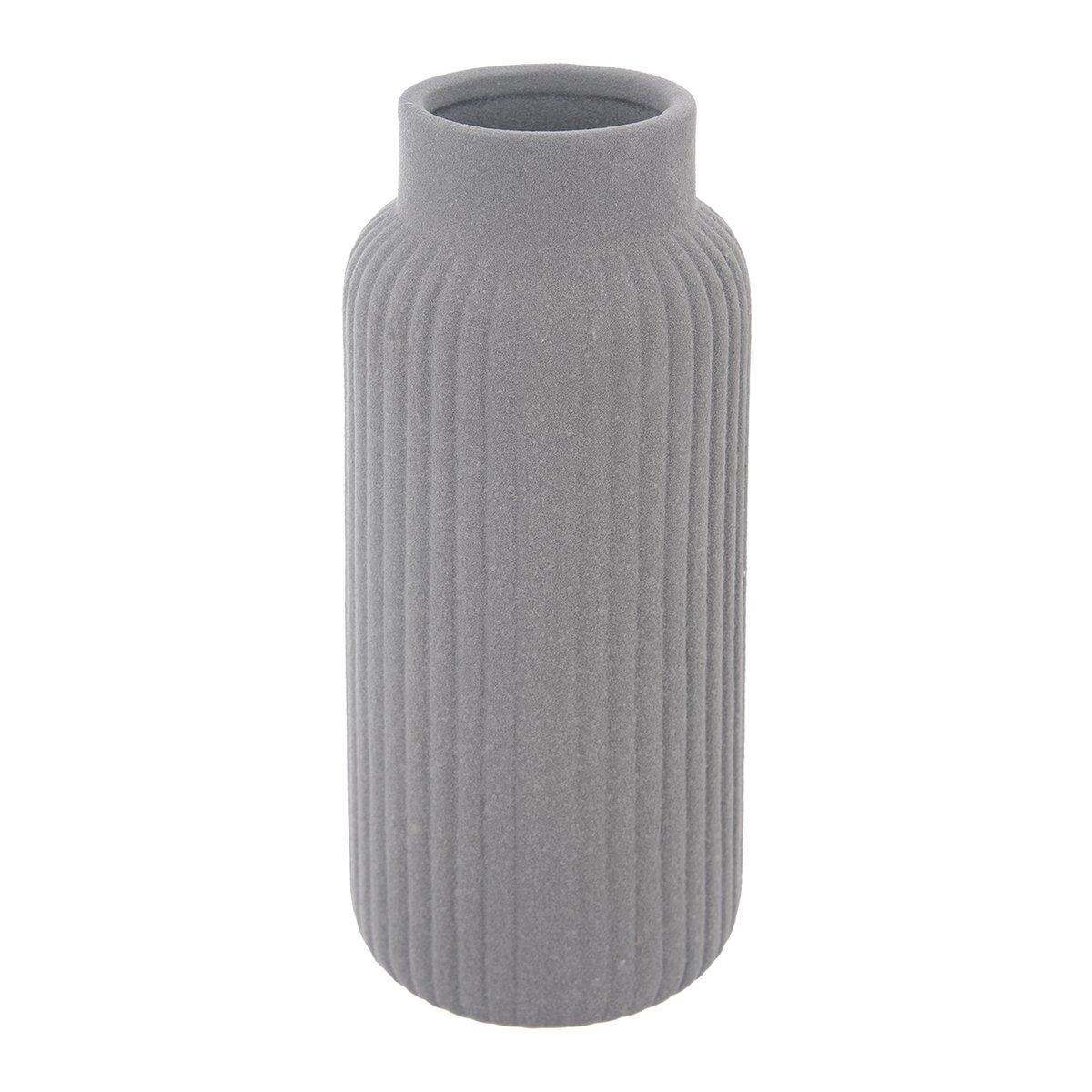 Kód produktu 820185Šedá porcelánová váza s hrubou strukturou a podélným žebrováním má výšku 24,5 cm a je vhodná na řezané i suché květiny nebo dekorativní traviny a větvičky.