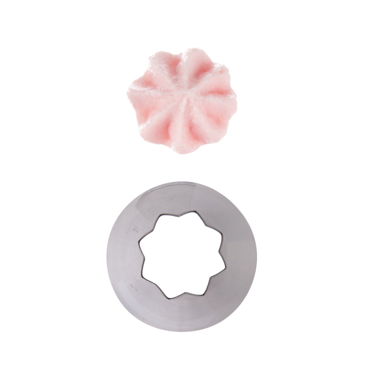 Kód produktu 153045Vyšší zdobicí nerezová špička s 8 cípy je vhodná ke zdobení dortů, cupcaků a zákusků krémem nebo šlehačkou.